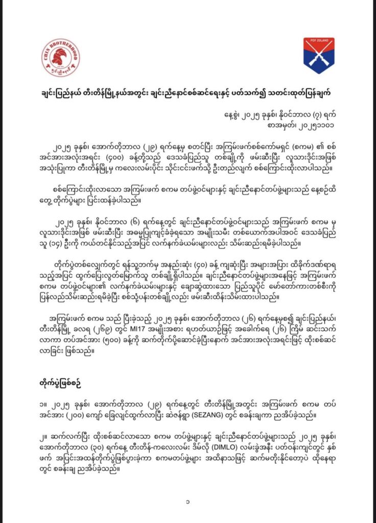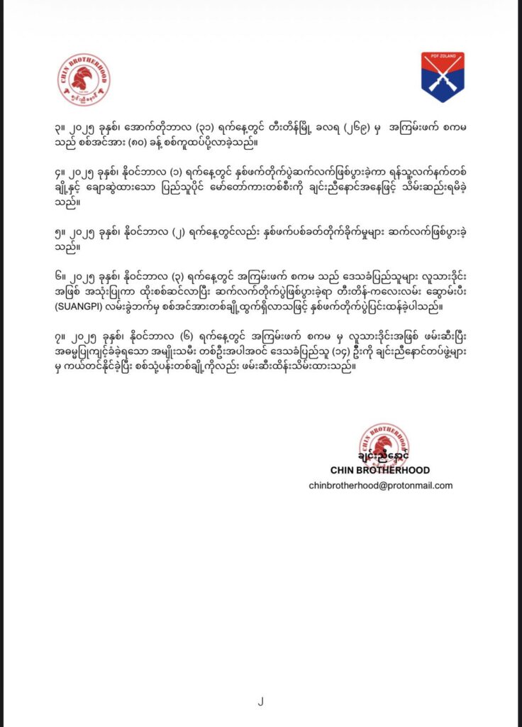 In Chin State, the Chin Revolutionary Forces have captured and controlled the towns of Falam, Mindat, Kanpalet, Matupi, Tonzang, Cikha, Rih Khawdar, Lailenpi, Kyindwe, Makyi Ein Nu, Naring, Rezua, Weibula, and Surkhua, while Paletwa and Sami are under the control of the Arakan Army (AA). Currently, only four military coulcil (SAM) bases remain in Hakha, Thantlang, Khaikam, and Tedim, and the Chin Revolutionary Forces have announced that they will work together in Chin State of the military council rids as soon as possible.