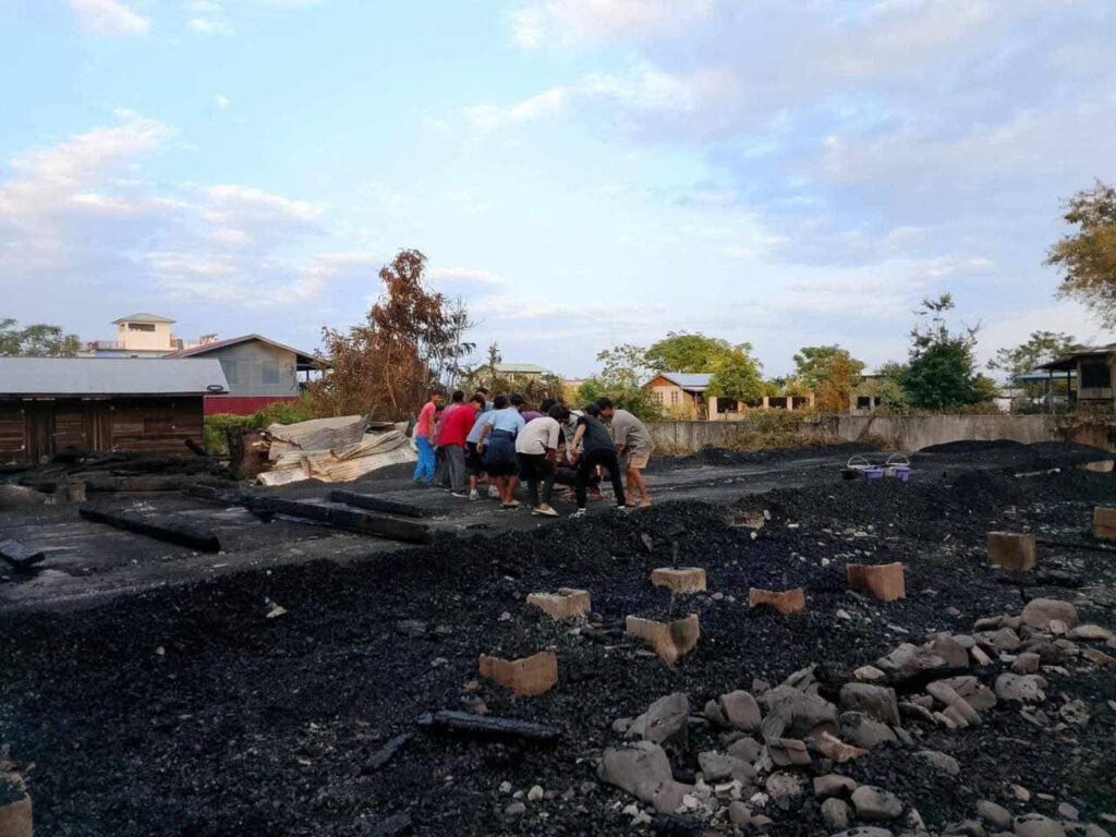 ” သစ်သား ကျောင်းဆောင် မီးလောင်သွားတာ၊ မဖွင့်တာ ကြာပြီလေ။ အရင်က စစ်ကောင်စီ တွေ ရှိတယ်။ အခုနောက်ပိုင်းမှာ မရှိဘူး၊ မီးက ရှို့မီးလို့ ပြောကြပေမယ့် သေချာ မသိကြဘူး။ မီးသတ်ကားတွေ ရောက်လာချိန်မှာ စစ်ကောင်စီ တွေလည်း ပါလာတယ်။ သေနတ်တွေကို မောင်းတွေ၊ ဘာတွေ တင်ပြတော့ မီးသတ်တွေ မလာခင် ငြိမ်းနေတဲ့ သူတွေက အကုန် ပြန်ပြေးကြရတာတော့တာ။ ” လို့ ဒေသခံတစ်ဦးက ပြောပါတယ်။ မီးကို ၁၁ နာရီခွဲ ၀န်းကျင်မှာ ငြိမ်းသတ်နိုင်ခဲ့ပြီး တခြားကျောင်းဆောင်နဲ့ နေအိမ်တွေကို မီးမကူးအောင် ဒေသခံတွေက ဟန့်တားနိုင်ခဲ့တယ်လို့ ဆိုပါတယ်။