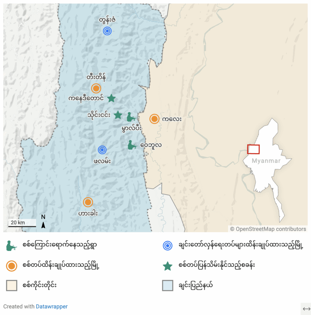 ချင်းပြည်နယ် မြို့နယ် ကိုးခုအနက် မြို့တော် ဟားခါး၊ တီးတိန်၊ ထန်တလန်တို့ကို စစ်တပ်က ထိန်းချုပ်ထားနိုင်ပြီး မတူပီ၊ မင်းတပ်၊ ကန်ပက်လက်၊ ဖလမ်း ကိုချင်းညီနောင်က သိမ်းပိုက်ထားပြီး ၎င်းတို့၏ မဟာမိတ် အာရက္ခတပ်တော် အေအေက ပလက်ဝကိုထိန်းချုပ်ထားသည်။ ချင်းပြည်ကောင်စီက တွန်းဇံကို သိမ်းပိုက်ထိန်းချုပ်ထားသည်။