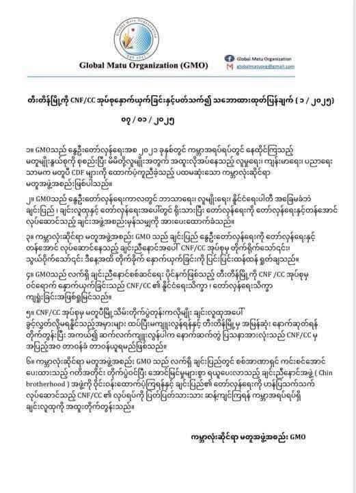 GMO ဟာ နွေဦးတော်လှန်ရေးအစ ၂၀၂၁ ခုနှစ်မှာ ကမ္ဘာအရပ်ရပ်ရှိ မတူမျိုးနွယ်စုကို စုစည်းပြီး မတူလူမျိုး များအတွက် အထူးလိုအပ်နေတဲ့ လူမှုရေး၊ ကျန်းမာရေး၊ ပညာရေး အပြင် မတူပီ CDF များကိုထောက်ပံ့ ကူညီခဲ့တဲ့ ပထမဆုံးသော ကမ္ဘာလုံးဆိုင်ရာ မတူအဖွဲ့အစည်းဖြစ်တယ်လို့ ဆိုပါတယ်။ လက်ရှိချင်းပြည်နယ်မှာ ဂတိအတိုင်း တိုက်ပွဲဝင်ပြီးတော့ အောင်မြင်မှုတွေရရှိလာတဲ့ ချင်းညီနောင် ကို ဝိုင်းဝန်းထောက်ပံ့ကြရန်နဲ့ တော်လှန်ရေးကိုဟန်ပြသက်သက်လုပ်တဲ့ CNF/CC ကိုဆန့်ကျင်ကြဖို့ GMO က ဖော်ပြထားပါတယ်။